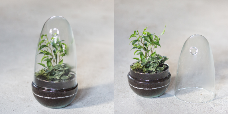 Do tworzenia zamkniętych kompozycji często wybierany jest komplet w kształcie jajka, najpopularniejszym modelem o tej rzeźbie jest W-527+W-527a z niewielkim (około 1,5 cm) bocznym otworem, który zapobiega gromadzeniu się nadmiernej ilości wilgoci, a co za tym idzie - powstawaniu pleśni i obumieraniu roślin. Na tworzenie ciekawych aranżacji roślinnych pozwala również terrarium szklane W-645+W-527. Komplet ten ma formę zbliżoną do gruszki - okrągła misa zestawiona jest z kloszem o wydłużonym ku górze kształcie. Taka forma klosza pozwala również na wygodne podnoszenie i odstawianie klosza bez nadmiernego palcowania kopuły. Więcej propozycji naczyń szklanych, które sprawdzą się jako baza do lasu w słoiku znajdziesz TUTAJ.